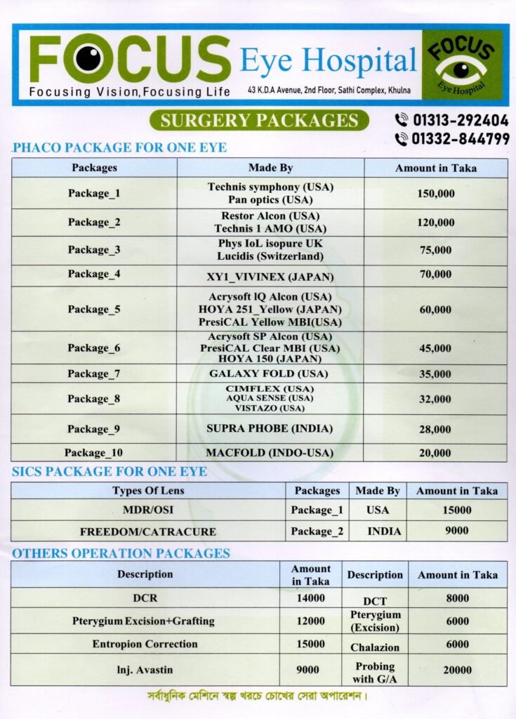 খরচ নির্ভর করে লেন্সের ধরন ও অতিরিক্ত প্রযুক্তি ব্যবহারের ওপর। ফোকাস আই হসপিটালে আপনি পাবেন বিভিন্ন বাজেট অনুযায়ী প্যাকেজ।